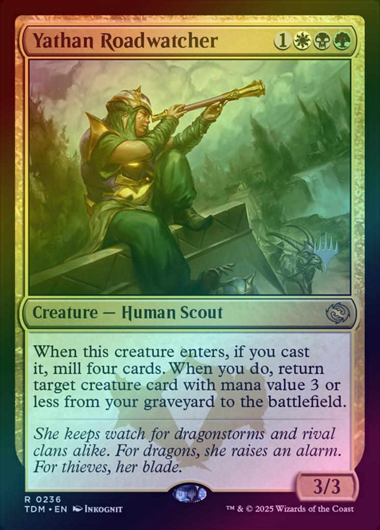 Yathan RoadwatcherCasting Cost: Card Type: Creature - Human ScoutPower/Toughness: 3/3Card Text: When this creature enters, if you cast it, mill four cards. When you do, return target creature card with mana value 3 or less from your graveyard to the battlefield.Flavour Text: She keeps watch for dragonstorms and rival clans alike. For dragons, she raises an alarm. For thieves, her blade.Artist: Inkognit