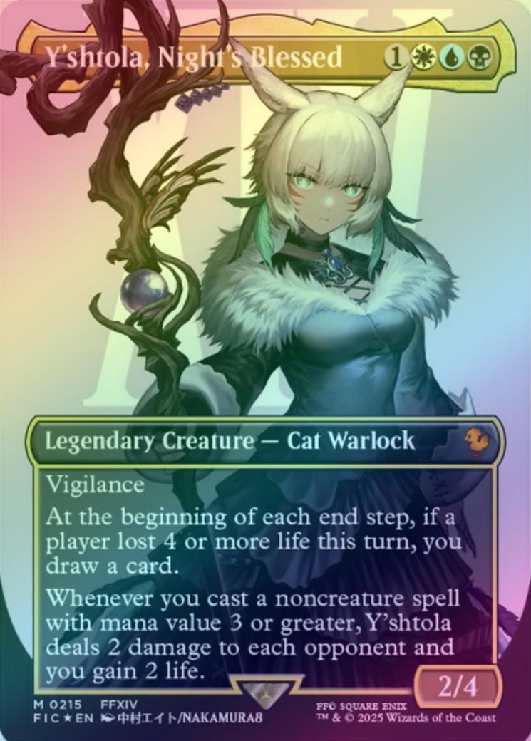 Y'shtola, Night's BlessedCasting Cost: Card Type: Legendary Creature - Cat WarlockPower/Toughness: 2/4Card Text: Vigilance At the beginning of each end step, if a player lost 4 or more life this turn, you draw a card. Whenever you cast a noncreature spell with mana value 3 or greater, Y'shtola deals 2 damage to each opponent and you gain 2 life.Artist: Nakamura8