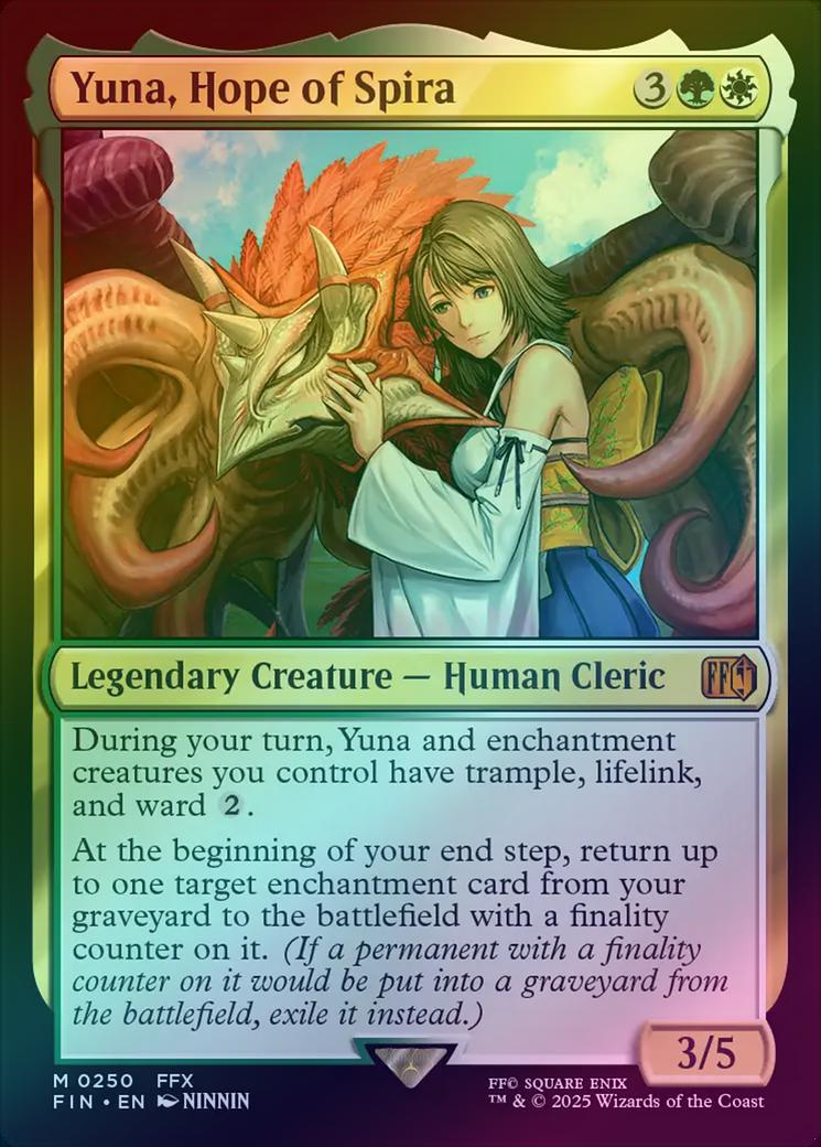 Yuna, Hope of SpiraCasting Cost: Card Type: Legendary Creature - Human ClericPower/Toughness: 3/5Card Text: During your turn, Yuna and enchantment creatures you control have trample, lifelink, and ward . At the beginning of your end step, return up to one target enchantment card from your graveyard to the battlefield with a finality counter on it. (If a permanent with a finality counter on it would be put into a graveyard from the battlefield, exile it instead.)Artist: NINNIN