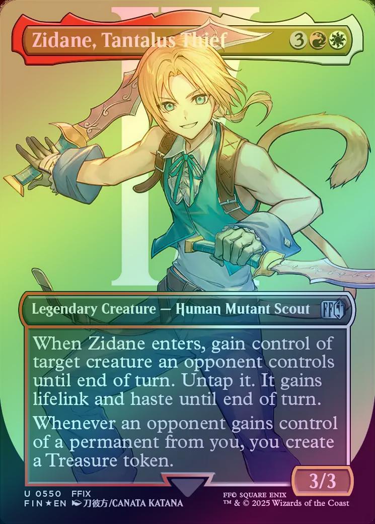 Zidane, Tantalus ThiefCasting Cost: Card Type: Legendary Creature - Human Mutant ScoutPower/Toughness: 3/3Card Text: When Zidane enters, gain control of target creature an opponent controls until end of turn. Untap that creature. It gains lifelink and haste until end of turn. Whenever an opponent gains control of a permanent you control, create a Treasure token.Artist: Canata Katana