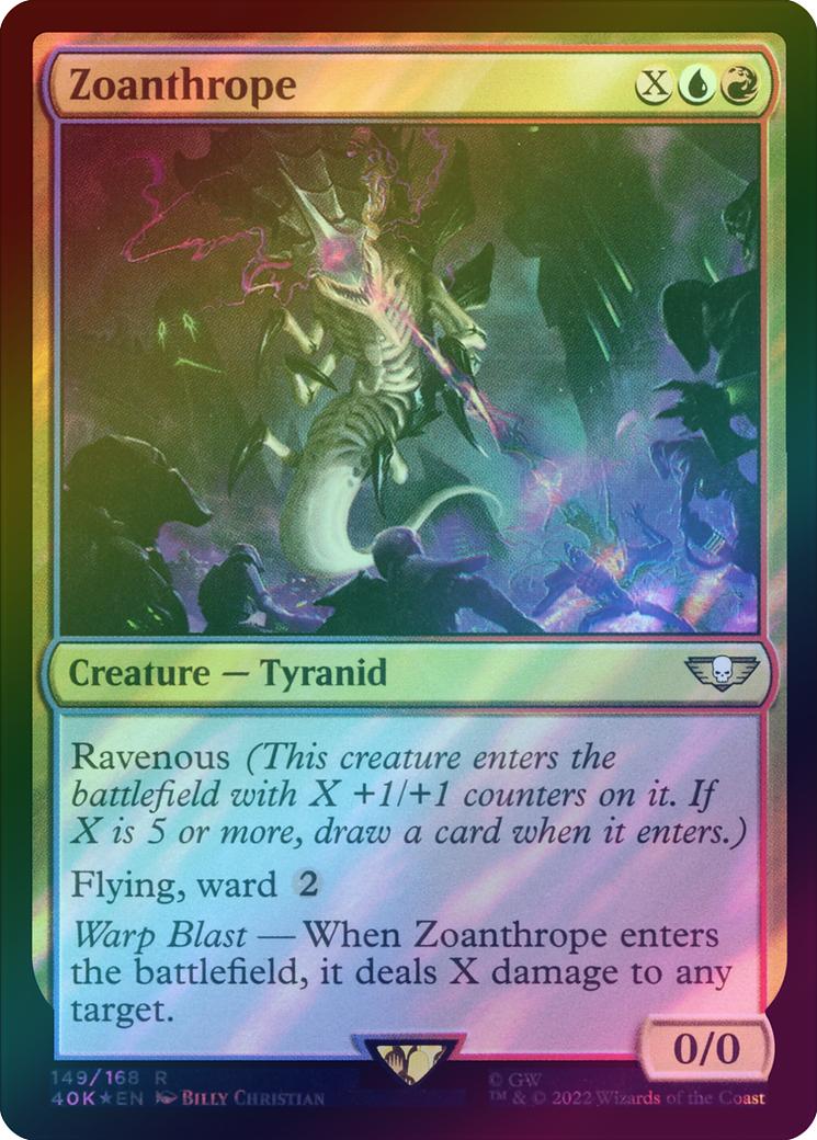 ZoanthropeCasting Cost: Card Type: Creature - TyranidPower/Toughness: 0/0Card Text: Ravenous (This creature enters with X +1/+1 counters on it. If X is 5 or more, draw a card when it enters.) Flying, ward Warp Blast - When this creature enters, it deals X damage to any target.Artist: Billy Christian